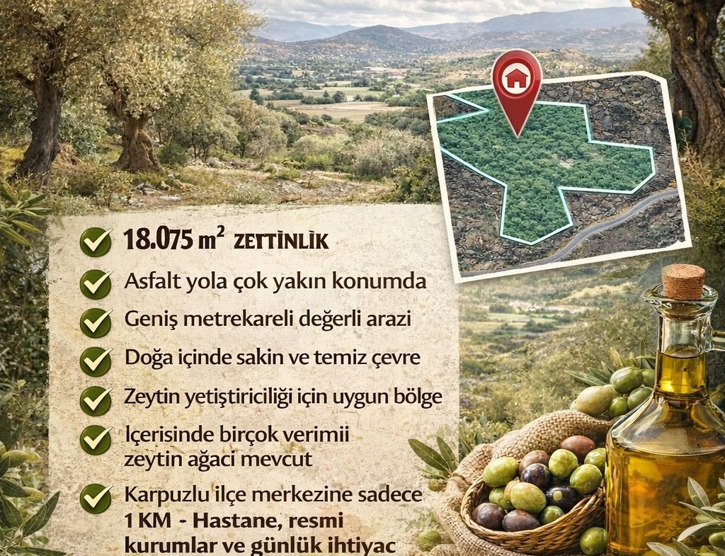 ✅ Karpuzlu merkezine yakın, asfalt yola komşu ve üretime uygun zeytinlikler nadiren piyasaya çıkar.