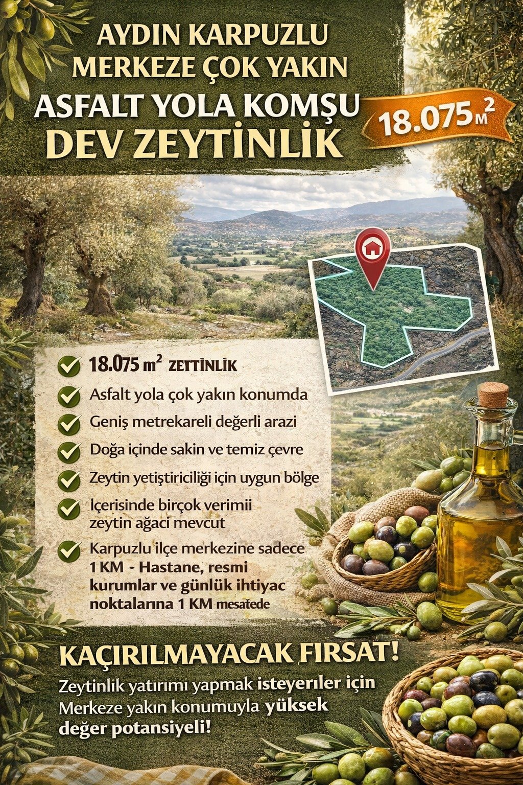 🏡 Karpuzlu Merkezine Çok Yakın, Yatırım ve Tarıma Uygun 18.075 m² Zeytinlik